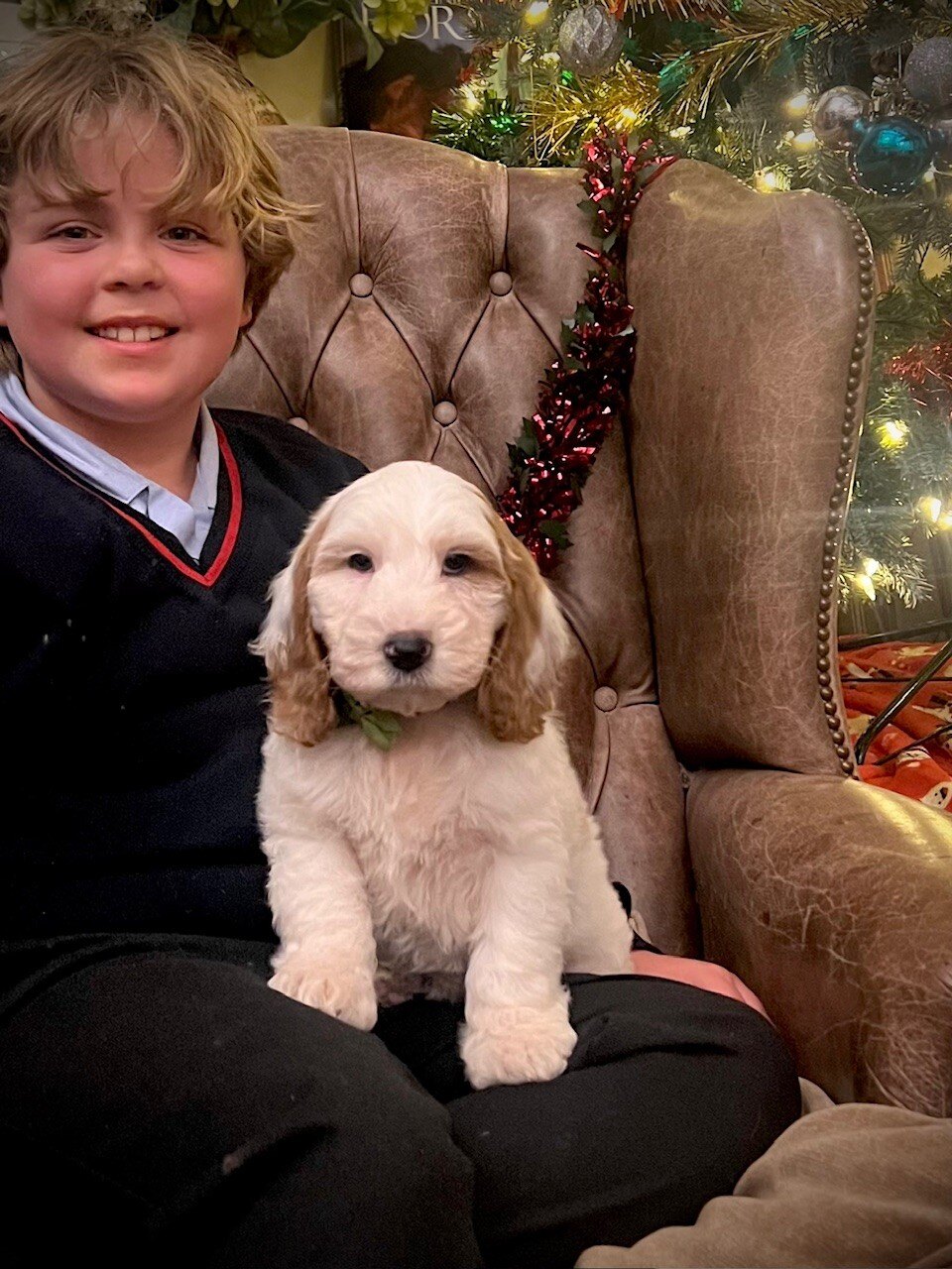 Golden is a fabulous mother, as we knew she would be, and is rearing these puppies very well. Golden is very well-bred, and is both kind & beautiful. She has the best nature, and we expect these puppies to make fantastic pets. Tux, being a Moyen (Standard x Mini Poodle), will leave larger puppies than our normal Mini cockapoos. We would expect these puppies to reach around 18'' to the shoulder, but time will tell! We are really keen to receive regular updates from this litter as they grow up!