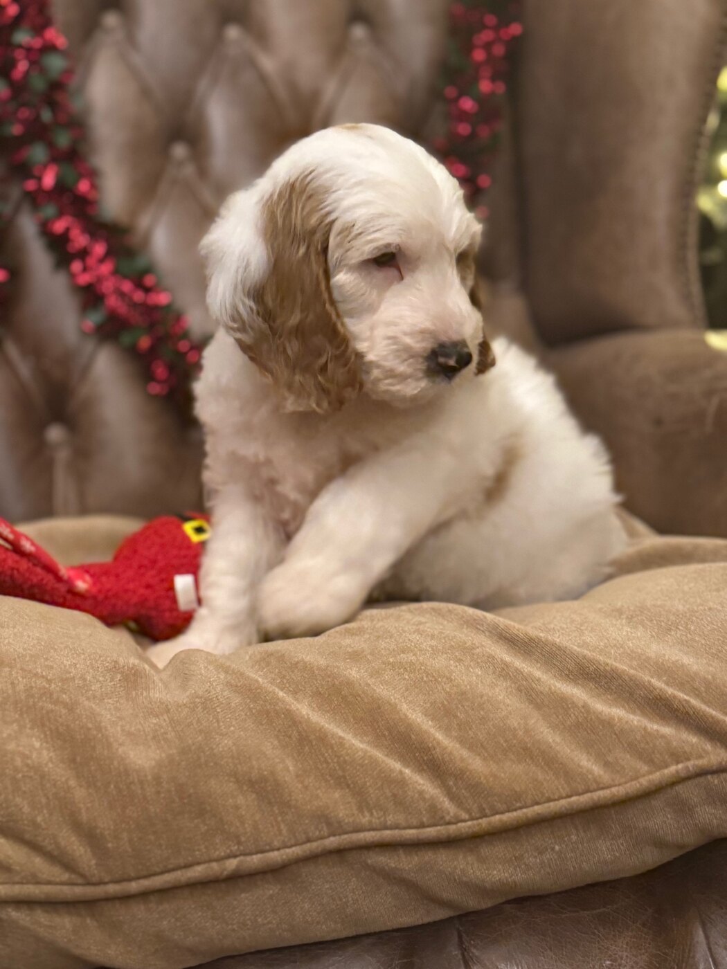 We haven't had parti coloured puppies since we had Alfie almost 10 years ago, so it's wonderful to see them here again. While little & without their wavey ringlets, they look quite white, but as the coat grows, they are absolutely stunning with the mix of reddish gold and cream curls! Their noses will continue to darken in the next few weeks, the spotty markings are a sign of the roan colouring they carry, and will mostly turn dark.