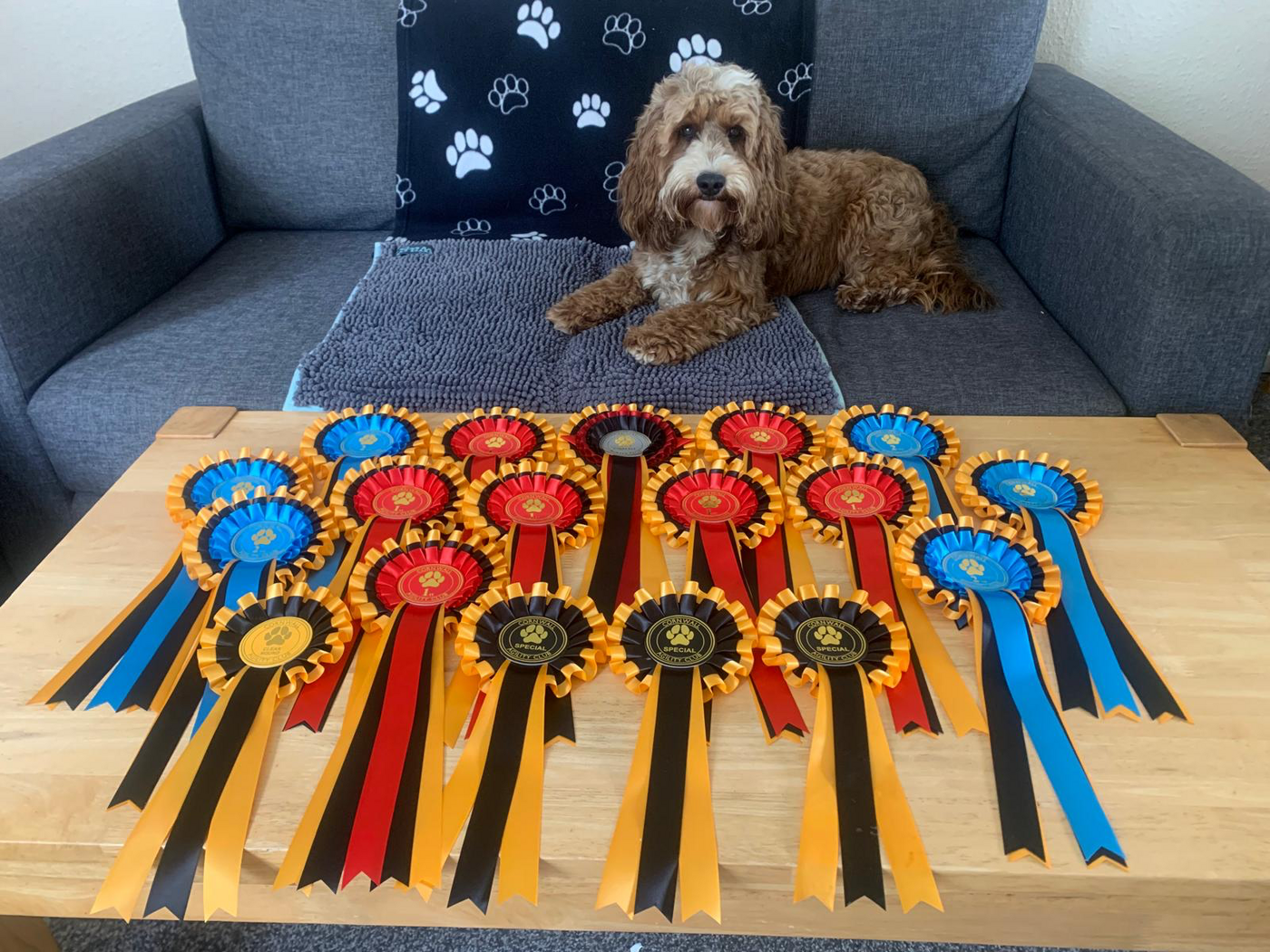 This’s my photo of my wonderful Charlie after the Cornwall Show, with the rosettes he won for agility that week. He’s not fast, but very willing, clever, and a quick learner. He’ll be three on 23rd of this month. Thank you once more for the most perfect companion 🥰